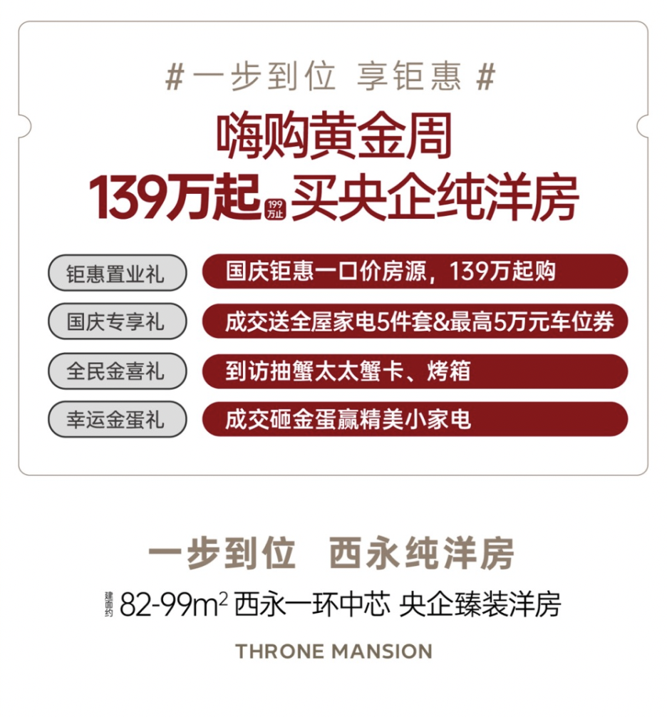 项目推出国庆四重礼,涵盖钜惠一口价房源、成交送全屋家电5件套&最高5万元车位券,以及到访抽蟹太太蟹卡、烤箱,成交砸金蛋赢精美小家电等优惠。