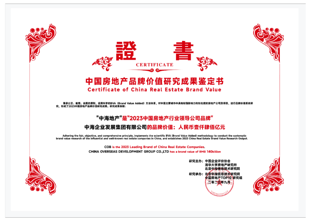 9月14日,由中国企业评价协会、清华大学房地产研究所、北京中指信息技术研究院主办的“2023中国房地产品牌价值研究成果发布会暨第二十届中国房地产品牌发展论坛”在京举办,中海企业集团助理总裁付熙嵬出席活动。中海地产第二十次荣膺“中国房地产行业领导公司品牌”,品牌价值蝉联行业第一,达1400亿元, 并获“2023中国房地产产品力优秀品牌"、“2023中国房地产顾客满意度领先品牌"荣誉。